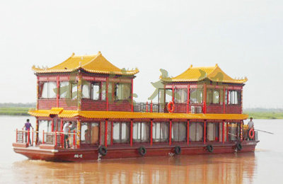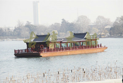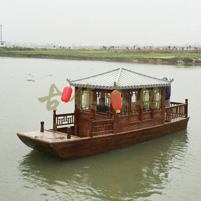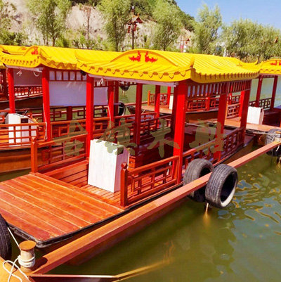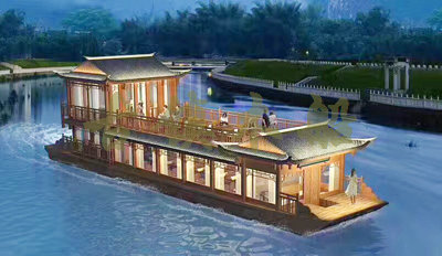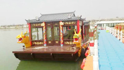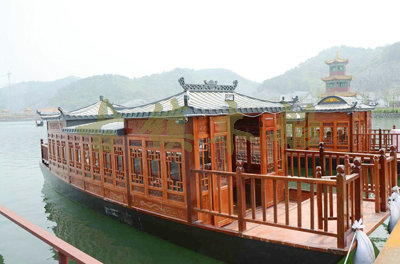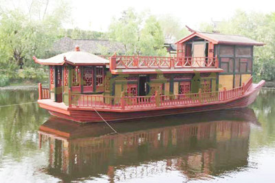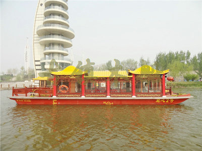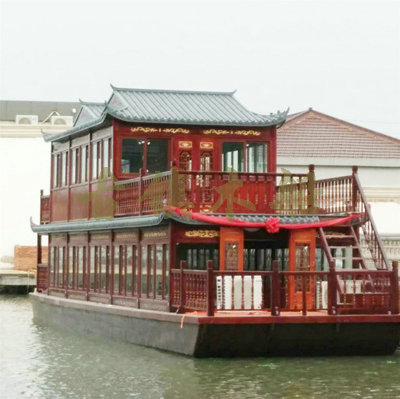 畫舫船就是裝飾古典華麗的游船,是"中國風(fēng)"的仿古游船,結(jié)合古典園林建筑,體現(xiàn)了中華文明的古典藝術(shù).畫舫船豪華而又古典,船上的建筑按照中國古代建筑里的亭臺樓閣,建筑工藝之復(fù)雜,要求之嚴(yán)格,仿古畫舫游船的特點飛檐翹角、玲瓏精致的四角亭子逐漸成形,赫然立于船頭,美人靠、盤龍柱子、彩畫……龍柱上的浮雕盤龍和祥云一層扣著一層,層層錯落有致,雕刻精細到盤龍身上的每一個鱗片都細細可數(shù),古代皇家標(biāo)志性元素,在畫舫船上體現(xiàn)的淋漓盡致。除了雕刻、花窗,整條船還有一個看點,那就是弧線優(yōu)美、高高翹起的船尾。游船并不大,長約10米、寬3米,但是整體看起來堪稱一件藝術(shù)品。船尾的雕花欄桿與船艙、船頭的雕刻遙相呼應(yīng),船身四周貼著浮雕祥云,給整條船增添了富貴、華麗的氣質(zhì)。